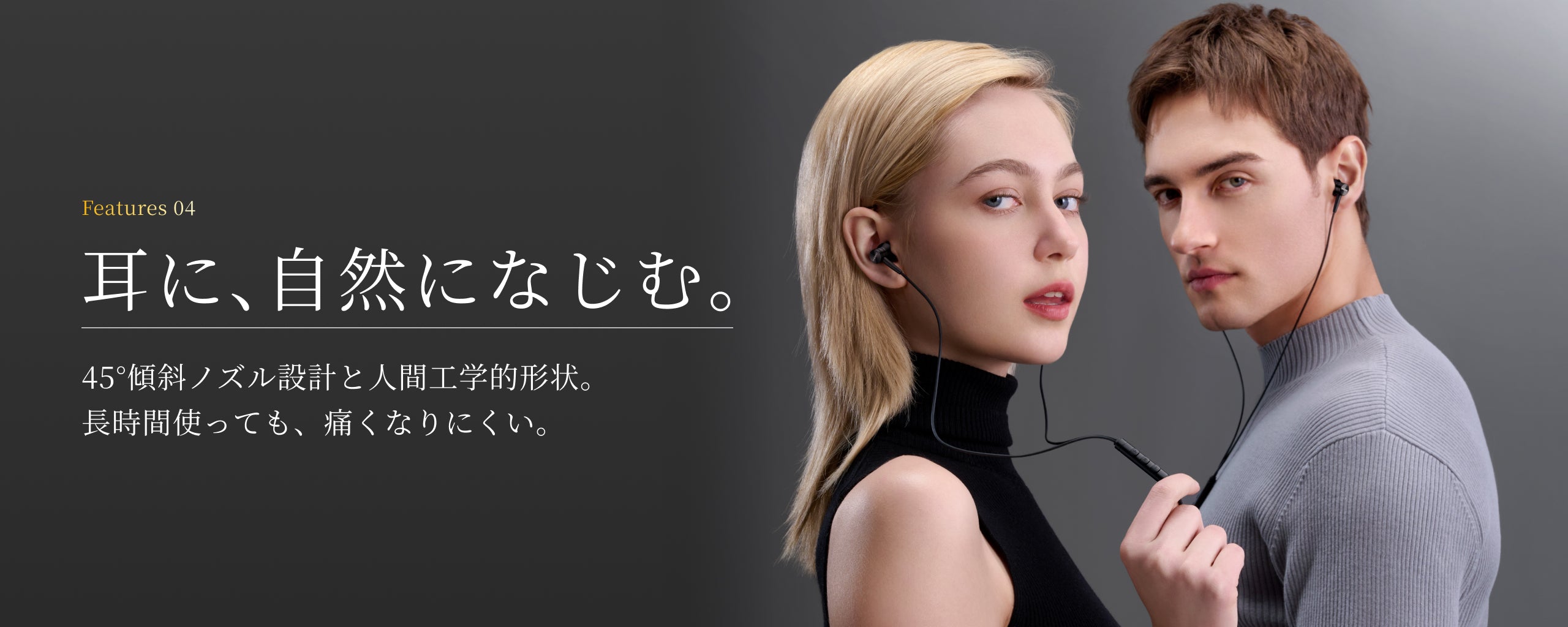45°の斜め挿入デザインで耳にしっかりフィットし、長時間使用でも痛くなりにくい設計。